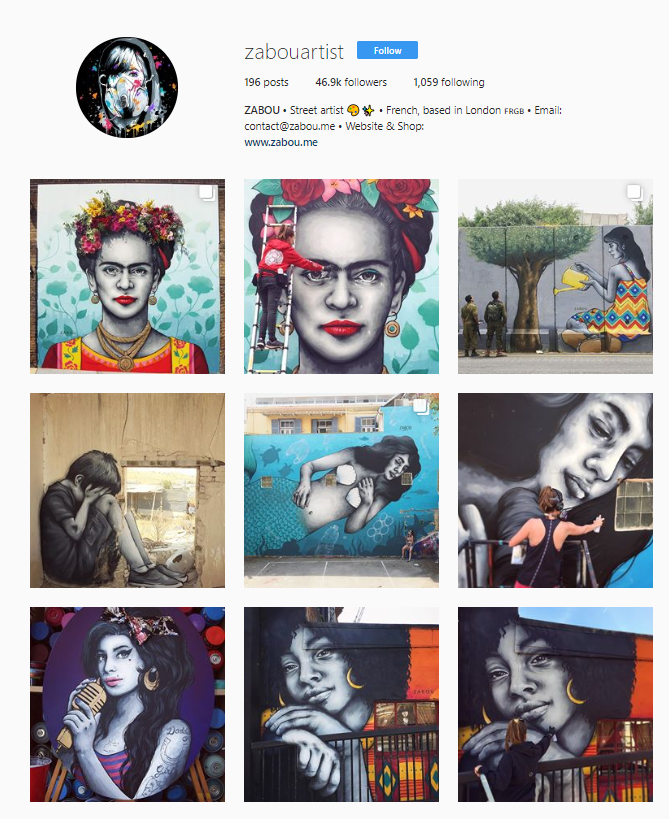 Zabou is a French artist, now living in Shoreditch - I'm a huge fan of her portrait work! Keep an eye on her Instagram so you can track down her latest work in London, which never disappoints. Although I'm already planning holidays to Cyprus, Paris and Israel to see her incredible work there. Why Zabou? Her name's Elizabeth but people always called her 'Zabou' from the middle part of her name.
